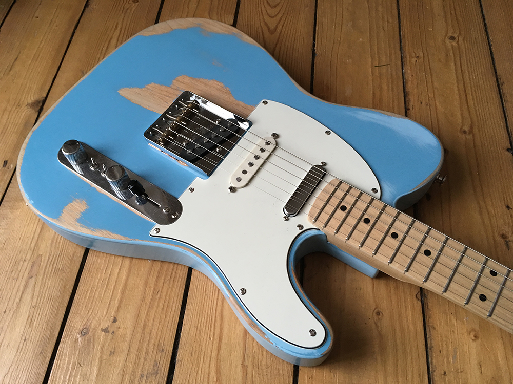 I’m not generally a fan of reliced guitars (unless it’s genuine road wear), but I’d sprayed this one Daphne Blue, and then changed my mind about the colour, so began sanding the finish off. A last minute gig came up, and I really wanted to try it out, so I hastily reassembled it and played it that night, in all its reliced “glory”. I never got round to taking it to pieces again to finish the sanding and respray it…